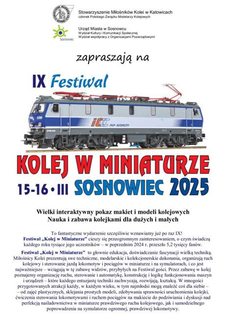 Najważniejszym mecenasem, mentorem wydarzenia Festiwal „KOLEJ W MINIATURZE” jest Miasto Sosnowiec, które każdego roku inspiruje organizację Festiwalu i udziela mu ogromnego wsparcia. To miastu Sosnowiec wciąż należą się ogromne podziękowania, że w tych niełatwych czasach odbywają się kolejne edycje Festiwalu, do tego z narastającym zadowoleniem tysięcy jego uczestników. W 2025 roku, podobnie jak w poprzednim 2024 roku, ta pomoc Miasta była szczególnie potrzebna. Bez dodatkowego wsparcia celem pokrycia kosztów obsługi budynku szkoły, gdzie Festiwal się odbywa, Stowarzyszenie Miłośników Kolei nie byłoby w stanie sprostać wymogom jego wynajmu na to wydarzenie.
